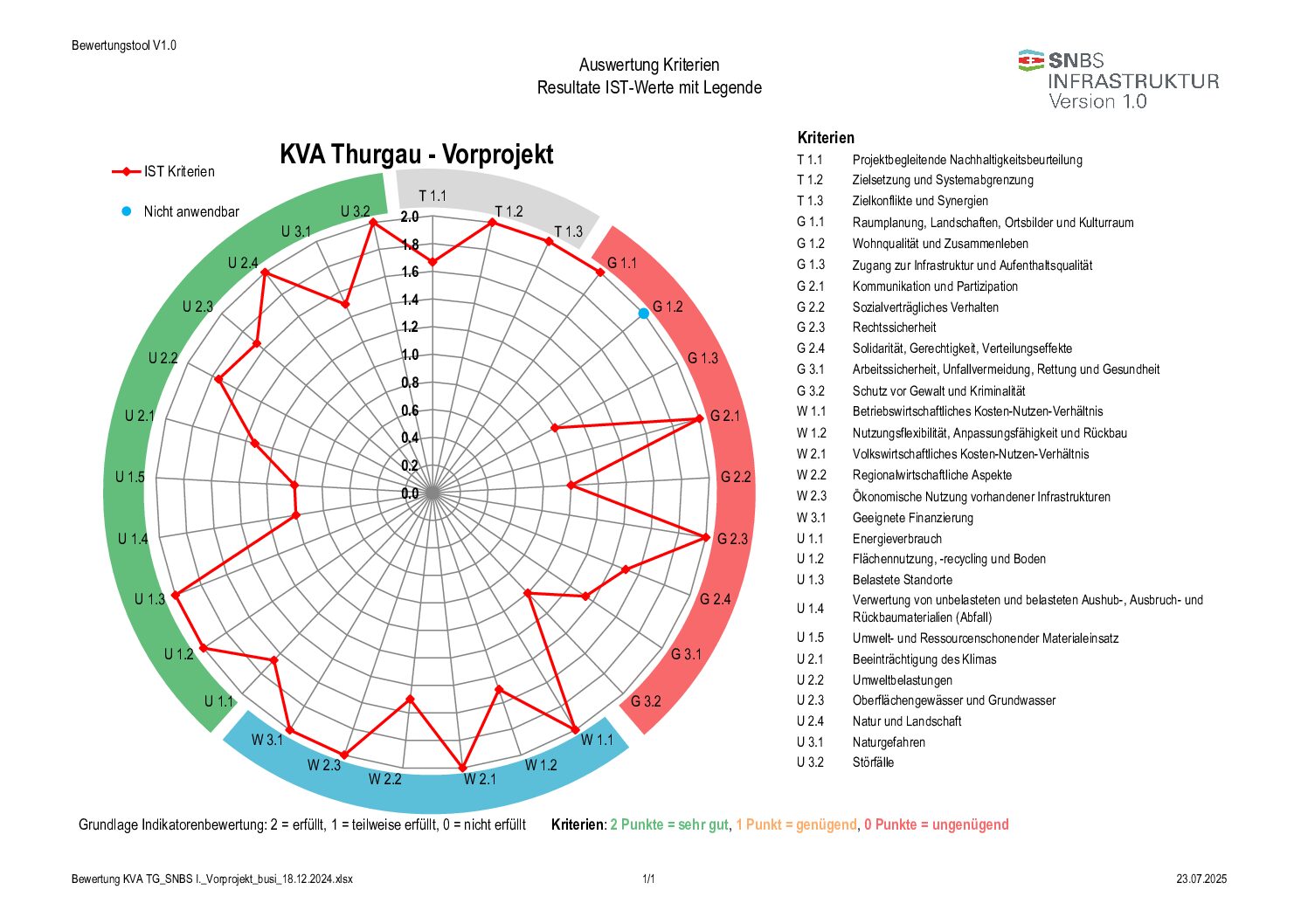Im Sommer 2025 laufen das Bauprojekt und die Vorbereitung der Baueingabe. Der Baubeginn ist für 2026 vorgesehen, wobei die Schaffung von Ersatzflächen für Amphibienlaichgebiete bereits vollzogen wurde. Weitere Informationen zum Projekt sind hier zu finden: Ersatz KVA Weinfelden | KVA Thurgau Der Verband KVA Thurgau fühlt sich der Nachhaltigkeit verpflichtet. Um diesen abstrakten Begriff konkreter und umsetzbar zu machen, wurde die Orientierung am SNBS-Infrastruktur als Projektziel aufgenommen. Neben der projektbegleitenden Integration wurde bereits zum zweiten Mal die SNBS-Infrastruktur-Bewertung durchgeführt. So konnte die Verbesserung von Note 1,3 auf 1,7 innerhalb des Vorprojekts sichtbar gemacht werden.