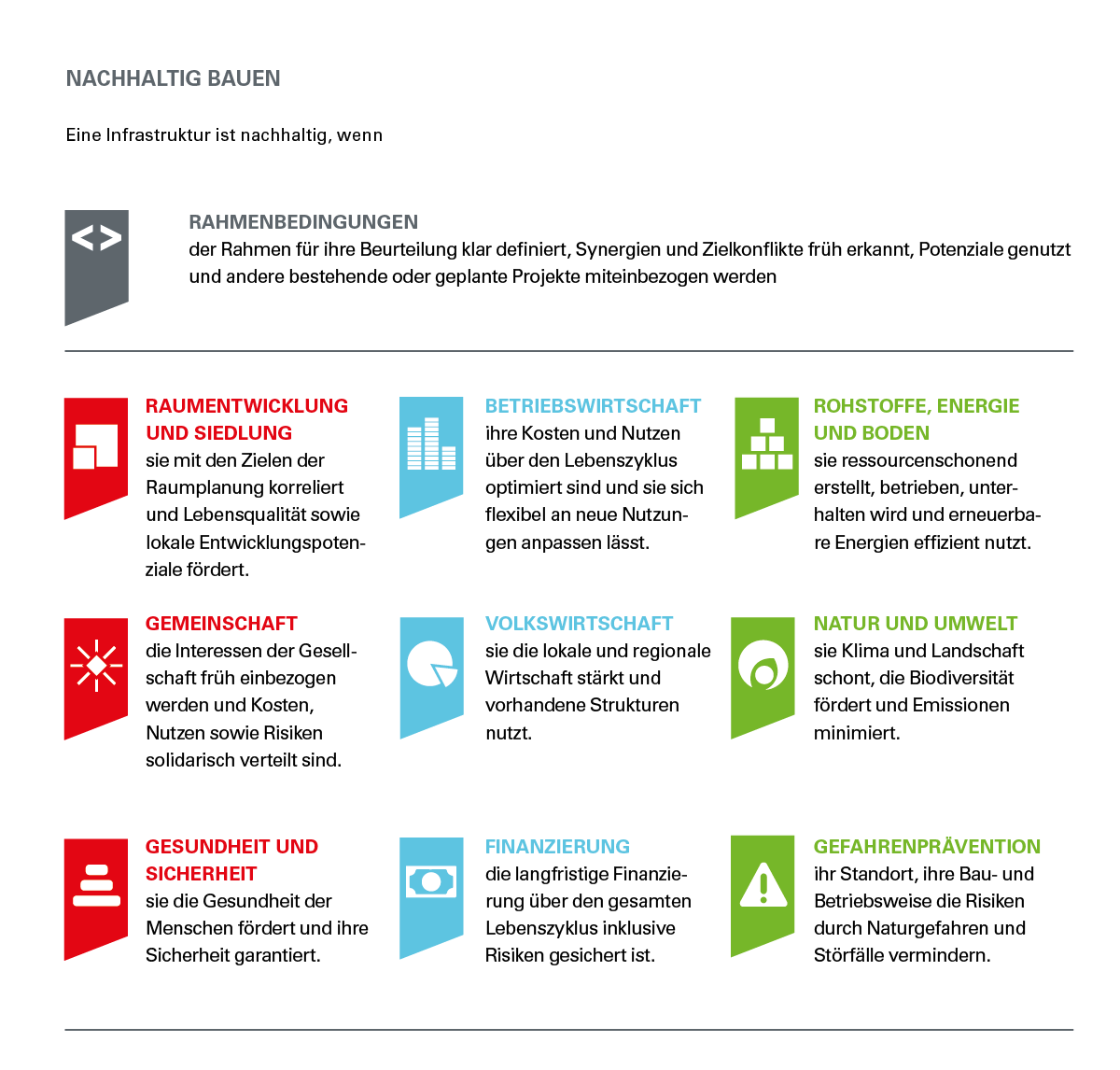 Der Standard hilft, bereits in den frühen Projektphasen die richtigen Entscheidungen zu treffen und die notwendigen Weichen für die Umsetzung zu stellen. Auch in allen späteren Projektphasen bis hin zum Rückbau dient er als begleitende Checkliste. Er hilft beim Hinterfragen bis anhin gepflegter Prozesse sowie bei deren Prüfung auf Vollständigkeit. Der SNBS-Infrastruktur ist ein praxisnahes Instrument, mit dem sich die Nachhaltigkeit eines Projekts aufgrund verschiedener Kriterien aus den drei Nachhaltigkeitsbereichen sowie aus übergreifenden, transversalen Themen planen und bewerten lässt. Im Gegensatz zu SNBS-Hochbau und SNBS-Areal kann er nicht zertifiziert werden.
